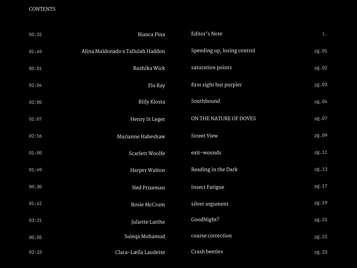 The poems in this issue were chosen for their substance & surface. For the way they reflect off each other & constellate parts that we hope form a circuitry; your attentive reading & listening, the spark.